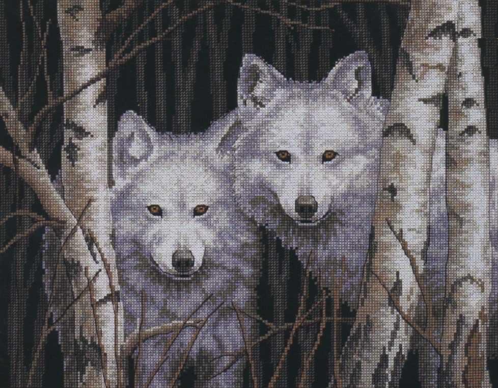 Начинать вышивать крестом картину, на которой изображена семейная волчья пара, рекомендуется с дальнего плана. Благодаря этому все элементы будут выглядеть эстетично и натурально.
