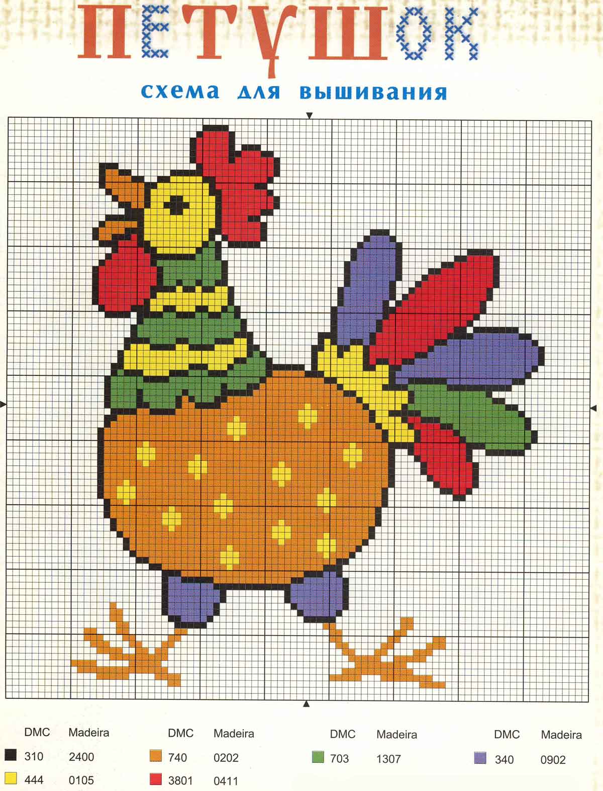 Для тех, кто выберет первый из вариантов приведу к примеру несколько картинок, схем, с помощью которых можно сделать отличную вышивку в виде петуха (символа Нового года 2017):