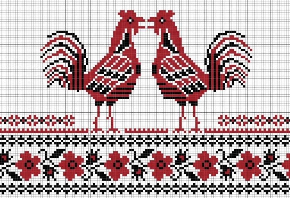 Монохромные орнаменты петухов, которыми можно украсить края скатерти, столовых салфеток, кухонных полотенец, оконных занавесей – наиболее простая и доступная вышивка для начинающих вышивальщиц. Для вышивки таких узоров традиционно используют красные нитки, которые будут выразительно смотреться на хлопчатобумажном или льняном полотне.