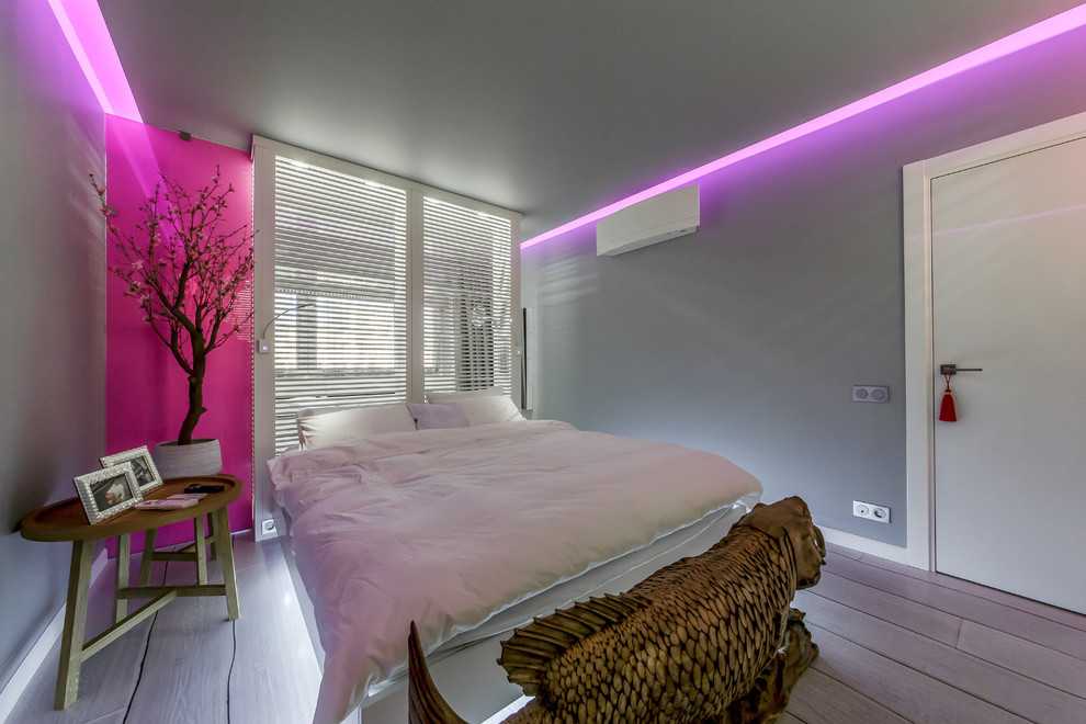 При невысоких потолках даже такая разница имеет значение. Поэтому часто выбирают светодиодную ленту, которую укладывают по периметру. В качестве центрального освещения подойдёт плоский округлый или прямоугольный прибор (софтобокс). Он располагается у самого потолка и потому практически не «съедает» высоту. Светодиоды и софтбокс используются вместе или по отдельности.