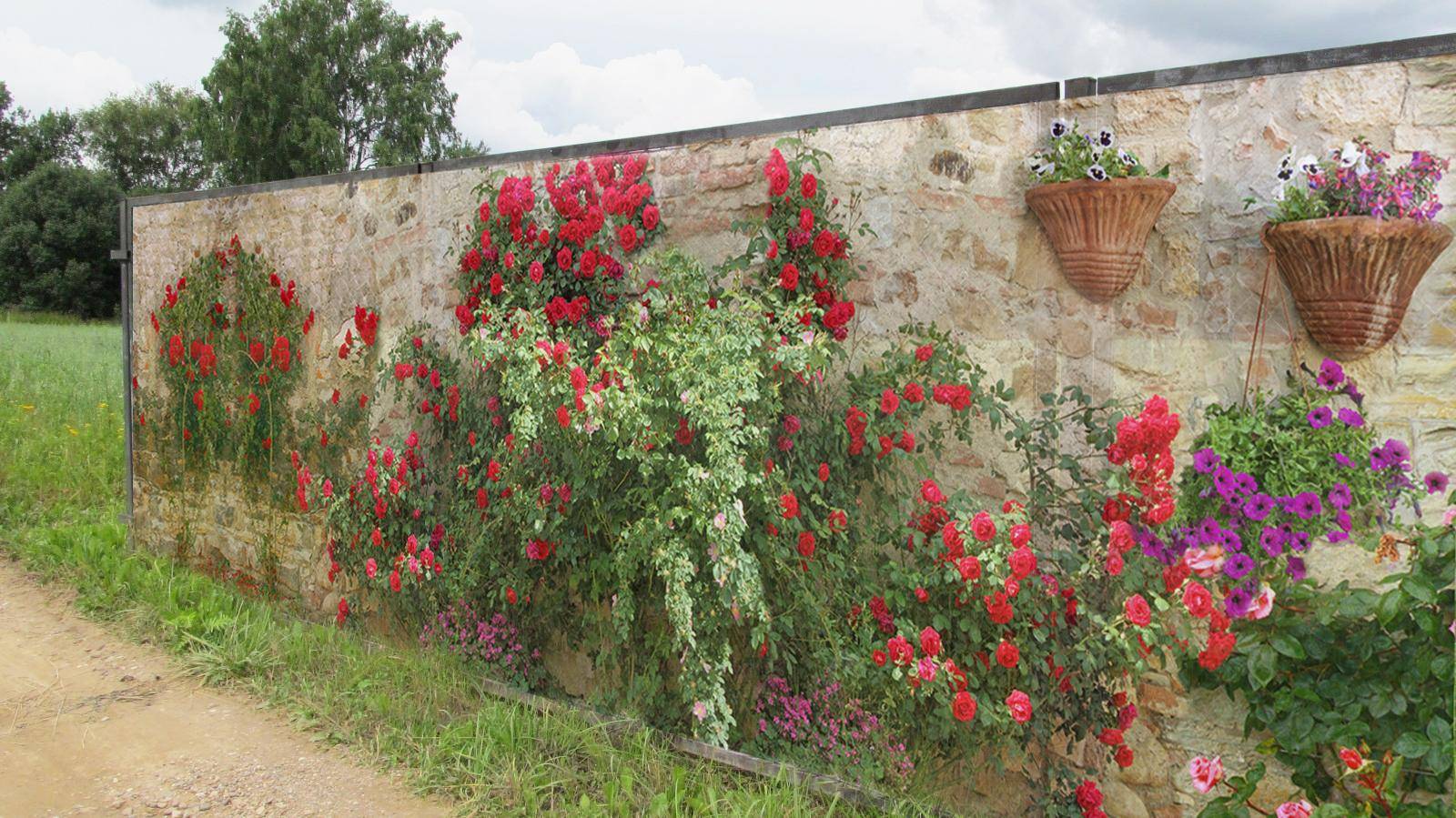 Оригинальное и не слишком дорогое ограждение, больше подходящее для загородных участков. Фотосетка на основе армированного ПВХ натягивается между опорными столбами и фиксируется металлическими креплениями. Для большей надежности ее можно укрепить поверх сетки-рабицы или не слишком красивого деревянного забора: получится стильная, долговечная и непроницаемая для посторонних взглядов ограда.