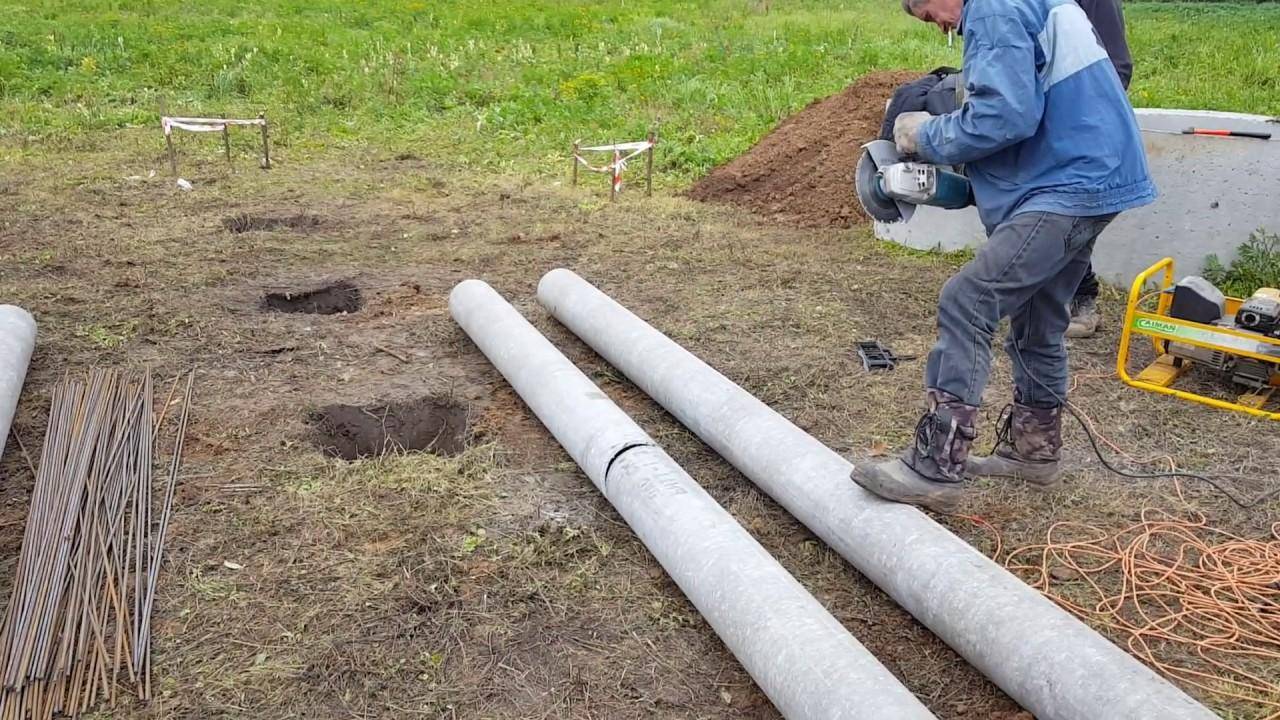 После установки всех опор и набора цементом прочности верхний слой фундамента из асбестоцементных труб сверяется при помощи лазерного уровня и, при необходимости, лишние части срезаются.