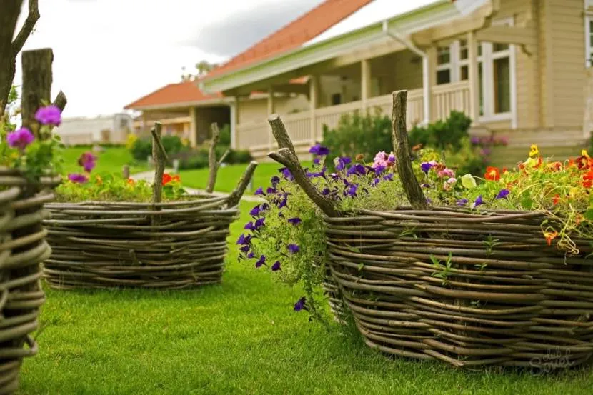 - Для цветов возможны два решения, которые используют по отдельности. Растения сажают вдоль плетня или выставляют в горшках. Если забор крепкий, на нем закрепляют плетеные корзинки с небольшими цветами (фиалками или петуньями).