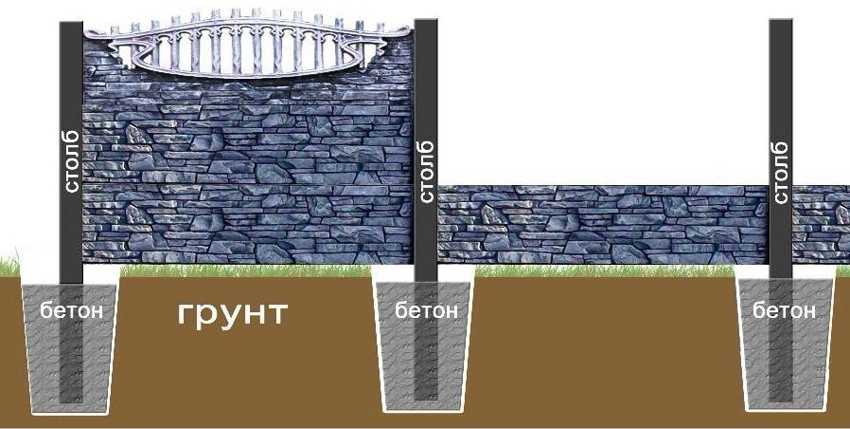 Между опорными элементами в соответствующие пазы вставляются модульные бетонные плиты. При установке ворот или калитки необходимо смонтировать отдельные столбы, к которым будут привариваться металлические закладные для створок.