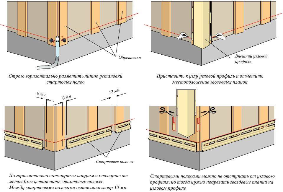 - Установка стартового профиля, угловых элементов, деталей обрамления оконных и дверных коробок;