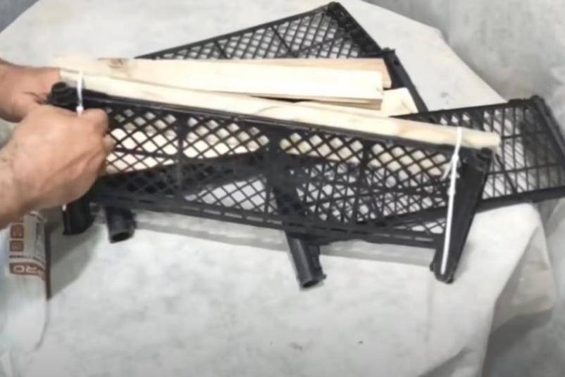 Закрепляем дощечки на решетке ящика с помощью пластиковых стяжек. Узлы хомутов размещаем на внутренней стороне ограждения.