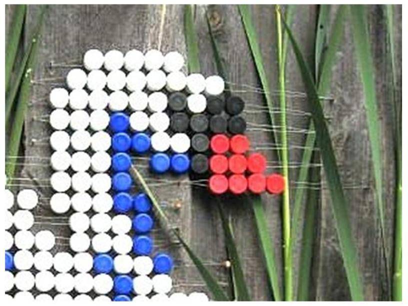 Широкое разнообразие цветов крышек от пластиковых бутылок позволяет сделать, практически, любой рисунок. Можно реализовать идеи, представленные ниже, или воспользоваться простыми схемами для вышивания крестиком. Особенно интересно сделать своими руками новую картинку. Приводим короткий мастер-класс изготовления украшения. Сначала на бумаге или экране компьютера на рисунок наносится сетка с шагом, соответствующим размеру крышек. Затем каждому квадратику подбирается пробка наиболее подходящего цвета.