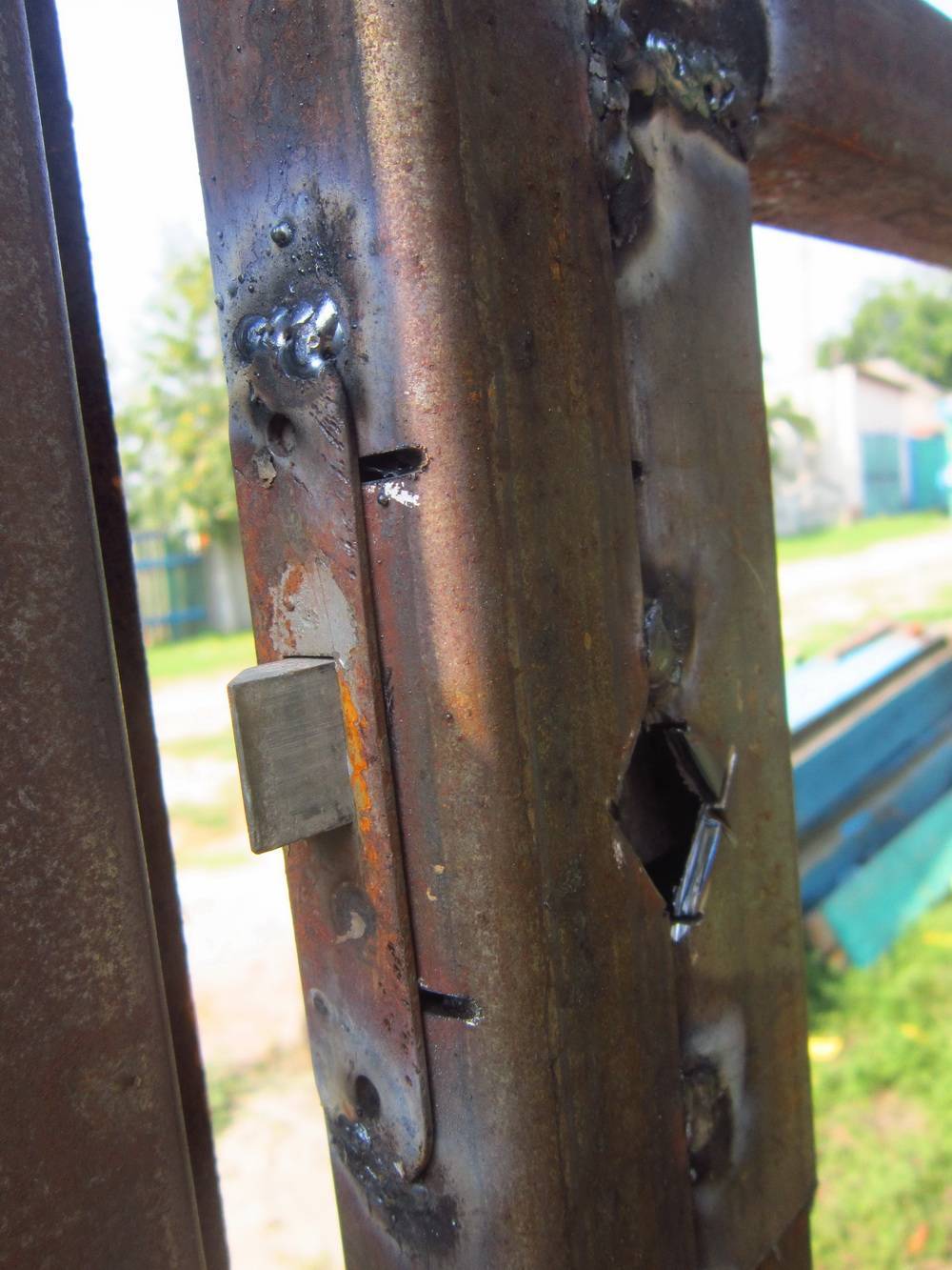 Последовательность и схема сварки данной конструкции может быть, в принципе, совершенно разной. Простейший вариант — кусок профиля приставить вертикально к столбу и приварить к нему петли. Затем повторить эту операцию со вторым столбом.