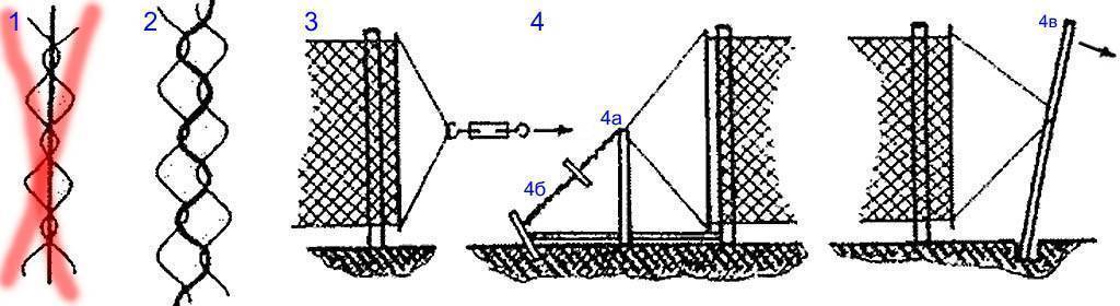 Также при монтаже забора из рабицы сетку нужно натягивать. Особенно – если забор натяжной по струне, тогда сетка должна быть натянута втугую. В методиках для этого рекомендуют пользоваться винтовым талрепом (поз. 3) или талями, но подручными средствами и с 2-мя помощниками можно обойтись и проще, поз. 4:
