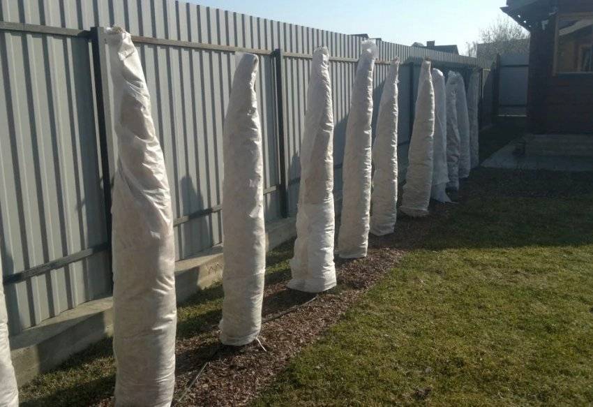 Если молодые саженцы укрыть, то они не погибнут зимой. Все работы необходимо проводить до выпадения снега. Для защиты наземной части используют нетканый материал белого цвета. Его продают в садовых магазинах. Молодые растения следует укрывать по одному, а взрослые — накрывают цельным куском вдоль и фиксируют с помощью шнура.