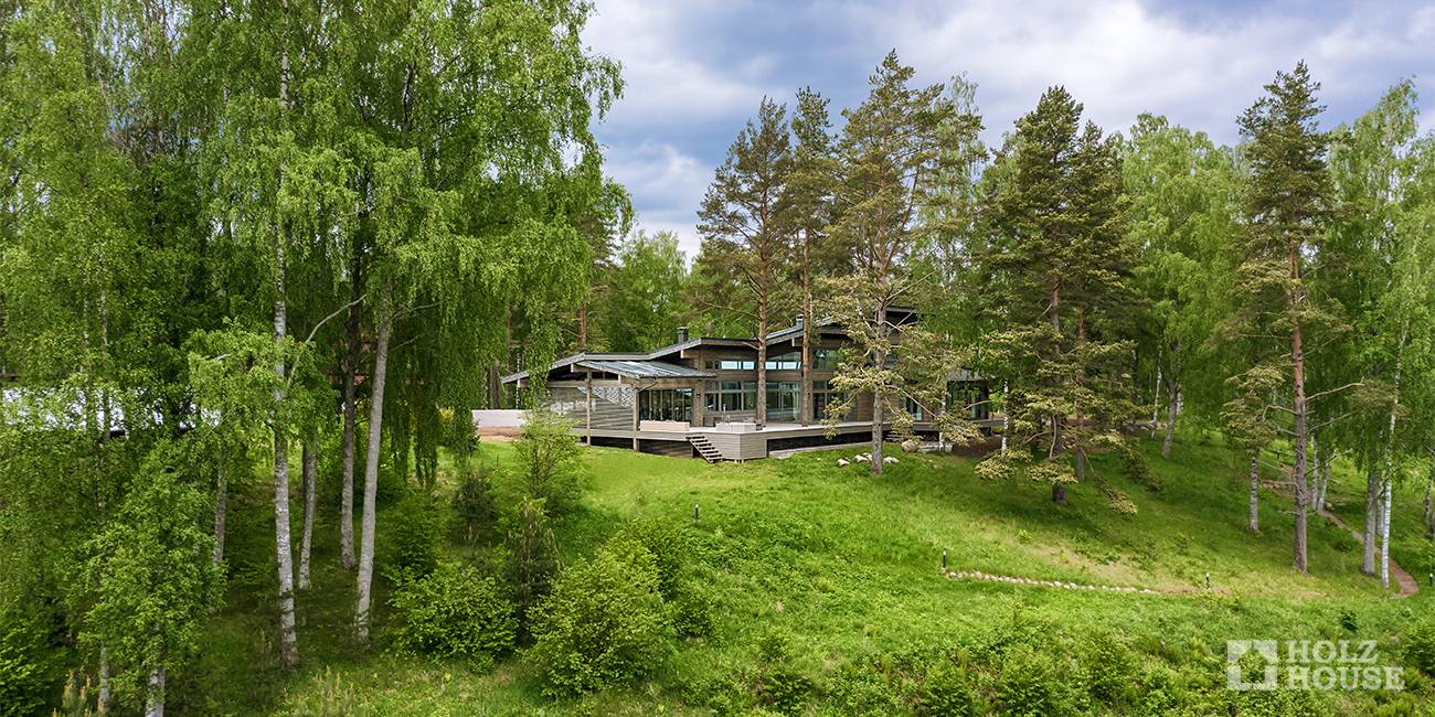 Панорамное остекление тоже часто используется при проектировании загородного дома на склоне. Большие окна помогают создать уникальный современный стиль здания и дают возможность созерцать со склона окрестности, не выходя из дома.