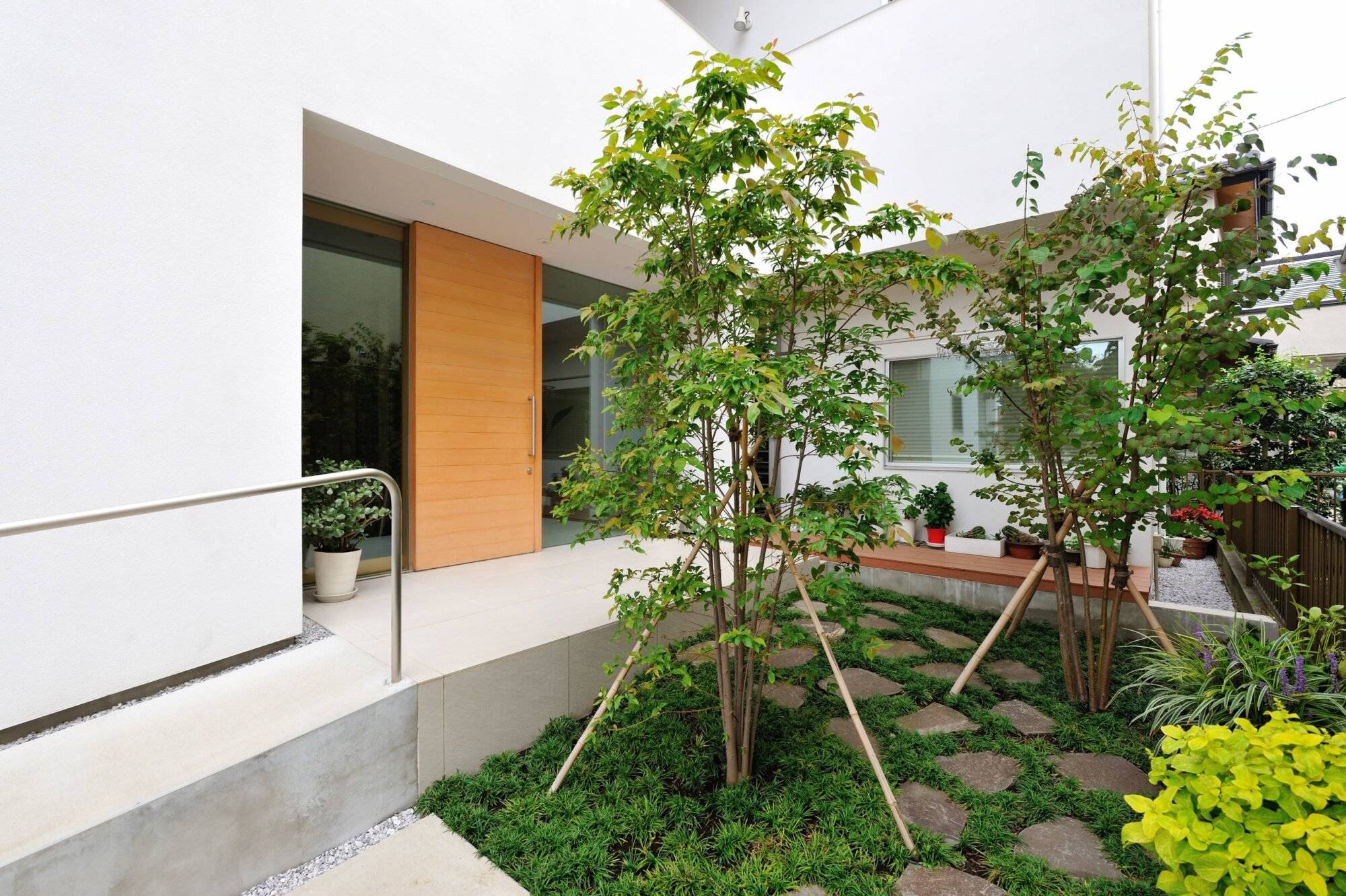 Сад озеленяют как плодовыми, так и декоративными деревьями. Очень часто встречаются также и хвойные.