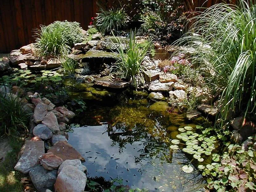 - пруд с рыбками и кувшинками, озеро с извилистыми берегами, небольшой водопад, выложенный натуральным камнем;