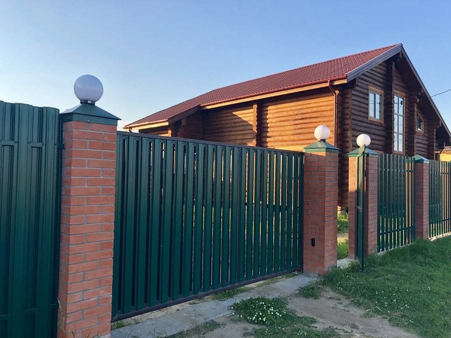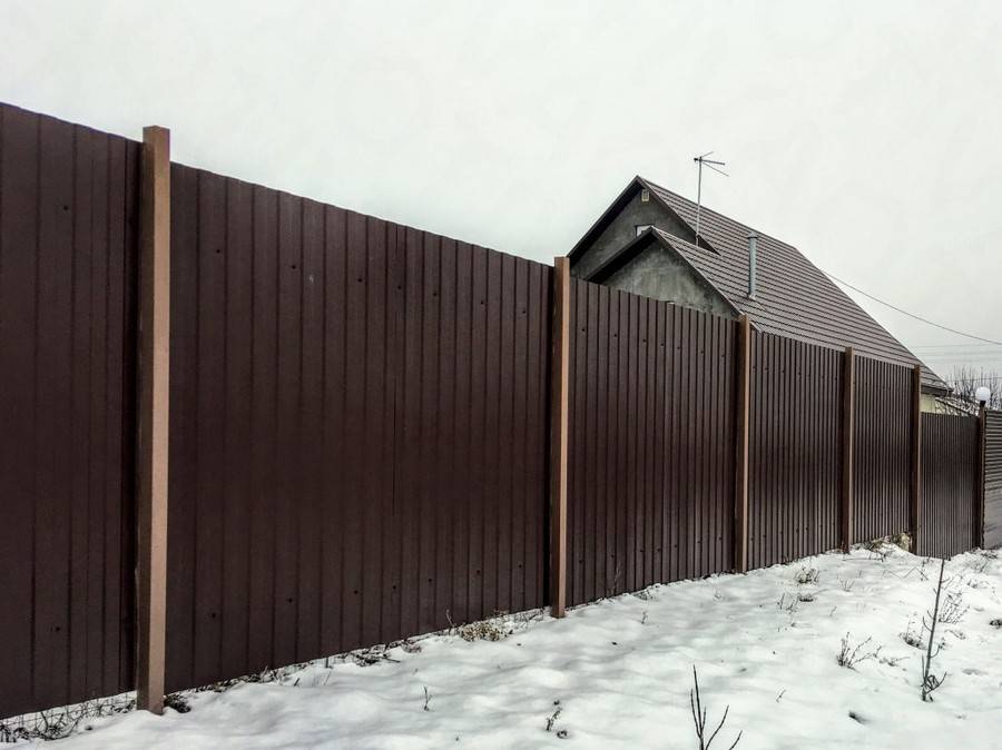 Глухие заборы для частного дома делают из стенового профлиста. Достоинства ограждения — большая цветовая гамма, многослойное защитно-декоративное покрытие, защищенность участка от проникновения, ветра и пыли со стороны дороги. Недостаток — высокие ветровые нагрузки (присущие для всех видов глухих пролетов).