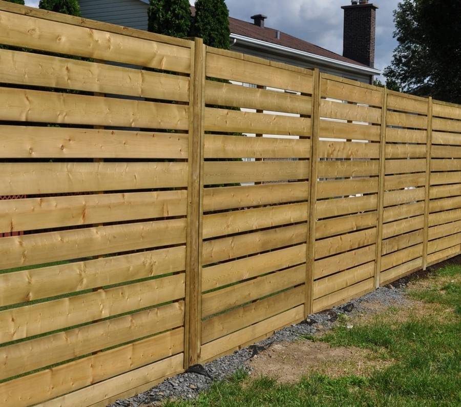 Принцип постройки этого забора такой же, как и у предыдущего, только жерди устанавливаются не вертикально, а горизонтально. Но некоторые отличия все же имеются. Начинаются они с каркаса: его столбики должны находится на одинаковом расстоянии, подходящим по длине штакетника. Еще один нюанс – выкладывать жерди нужно строго по уровню, чтобы конечный результат выглядел ровно и привлекательно.