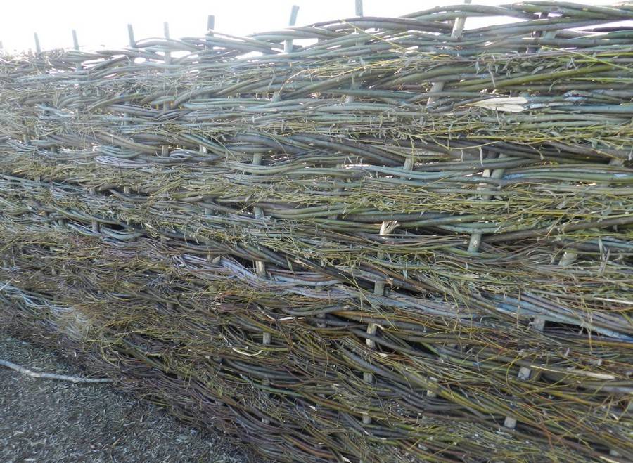 Этот подвид деревянного забора чем-то похож на горизонтальный штакетник по способу укладки материала. Плетеное ограждение – самый бюджетный вариант, который больше подходит для декорирования, нежели защиты. Сделать такую конструкцию несложно, но на это нужно будет потратить достаточное количество времени. Особой долговечностью плетеный забор не отличается, но, если с жердей снять кору и обработать их спецсредствами для защиты, то можно продлить ограждению жизнь на пару десятков лет.