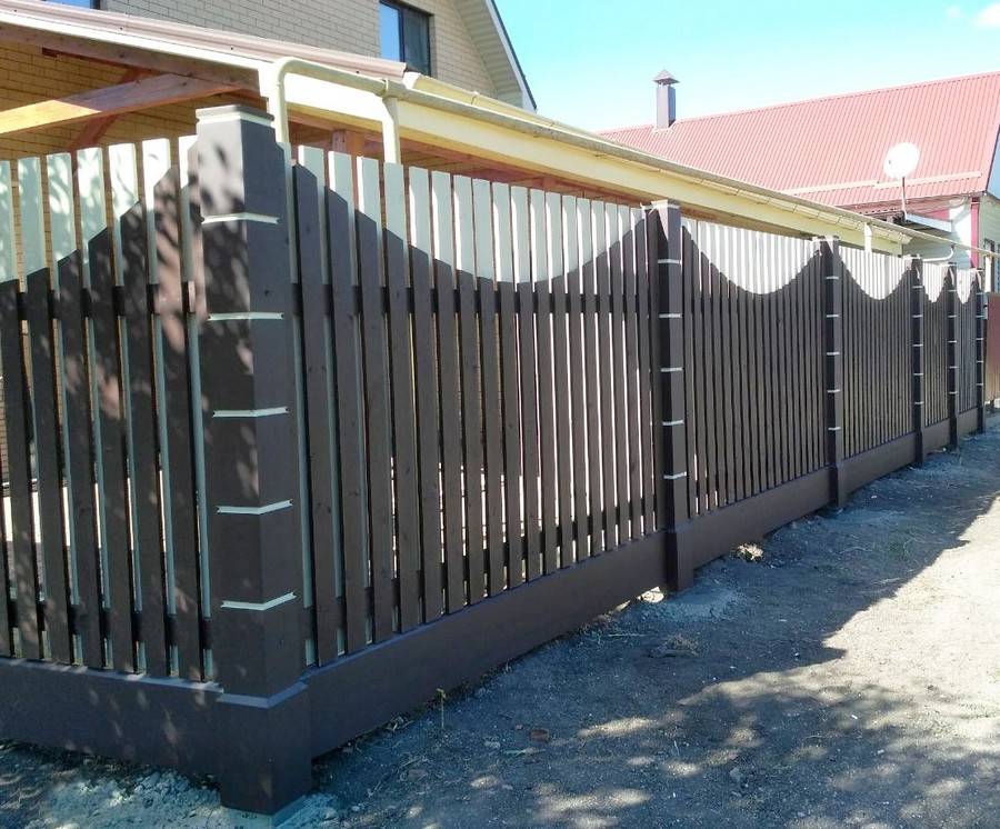 Еще один современный вид — металлический штакетник. Их него делают как решетчатые, так и практически глухие заборы. Это еще один вариант металлического листового профиля, но небольших размеров. Как и у профлиста, у металлического штакетника достаточно высокая жесткость и высокая устойчивость к коррозии.