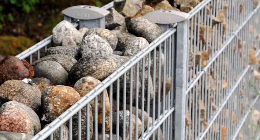 На заметку! В качестве основы можно купить габионы для забора промышленного изготовления из оцинкованной проволоки, использовать сетку из скрученной проволоки с шестиугольными ячейками или сварить сетку из толстых стальных прутьев.