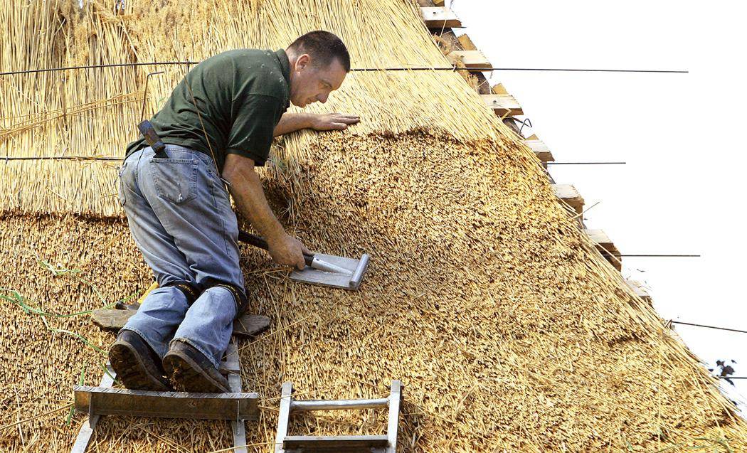 5. Для укладки самого нижнего ряда понадобится либо лес, либо лестница. Со следующими рядами уже проще — передвигаемся по обрешетке. Каким образом будет формироваться свес покрытия? Средний показатель отступа от стены — 50 сантиметров. Структуры и плотность укладки должна быть равномерной без допущений даже в миллиметрах! Для увеличения скорости укладки и простоты, используйте крюки. Они на время закрепят пучки с проволочной прошивкой.6. Если действовать строго по правильной технологии, то нужна очистка подбивка кровельного покрытия. Но без опыта работ не стоит проделывать данную процедуру. Вдобавок, нужно большое количество специальных инструментов.