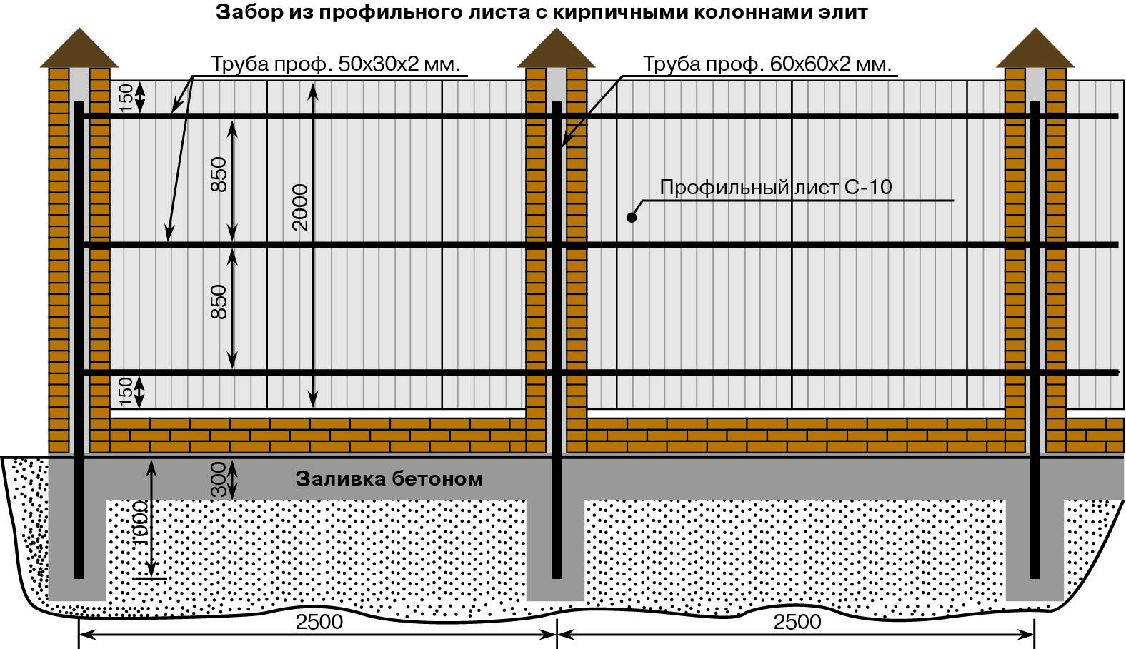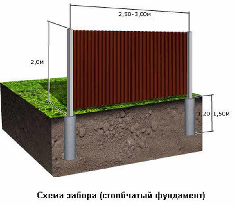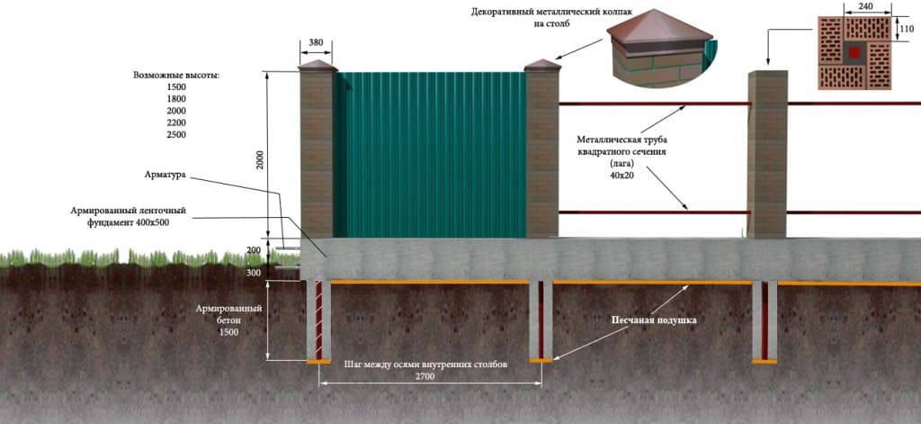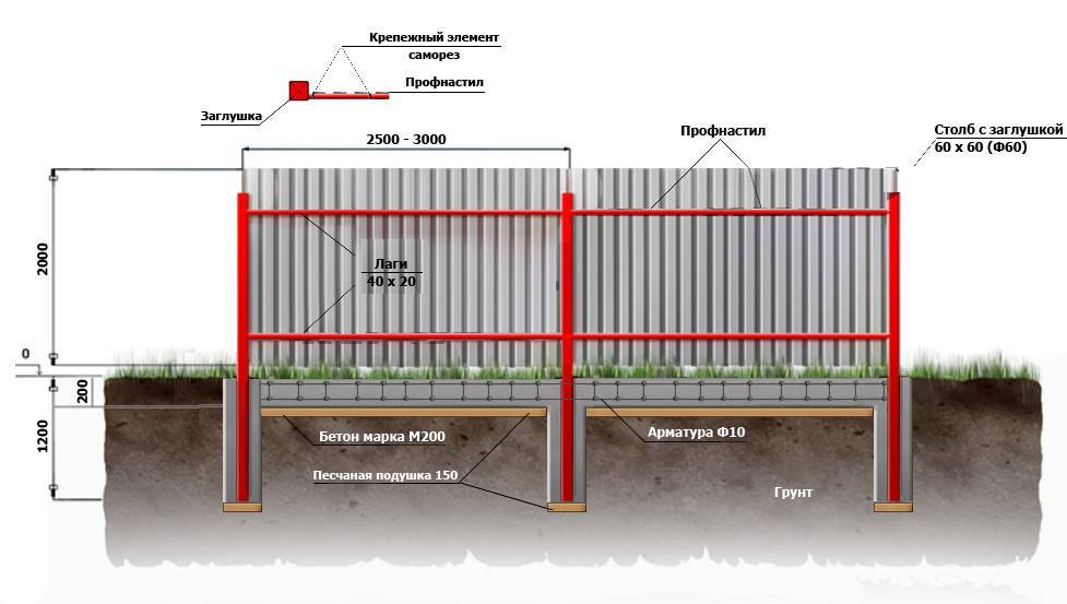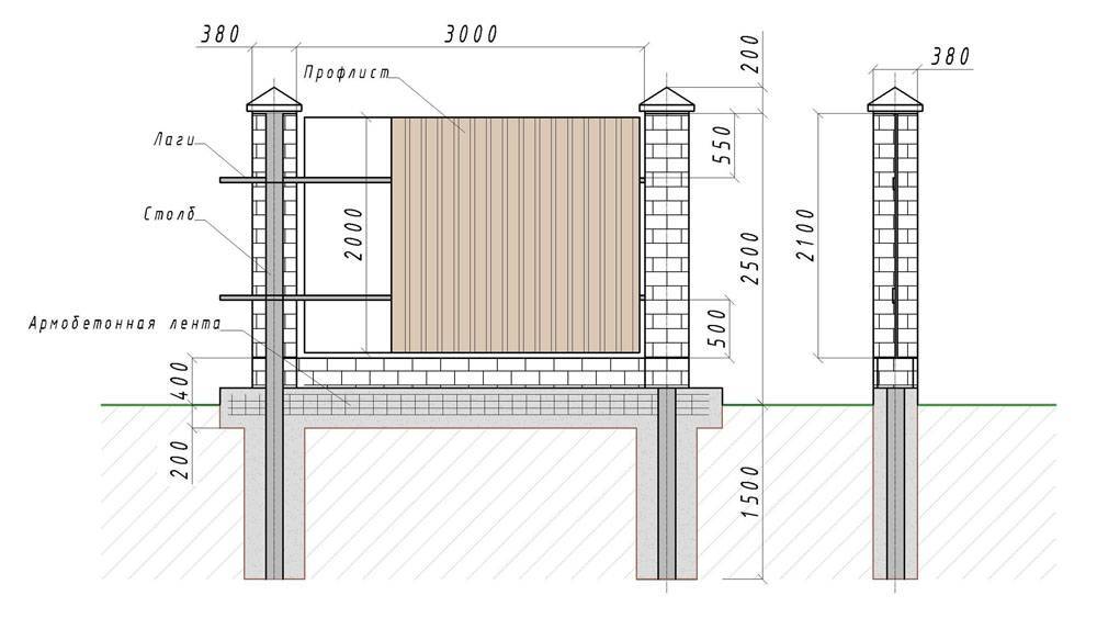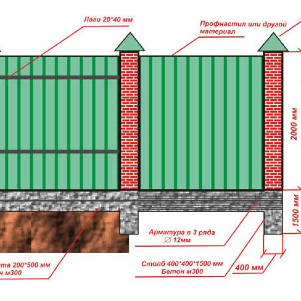 Забор из профлиста под камень устанавливают на столбчатый фундамент. Простое исполнение ограждения из профилированного настила – это сплошная конструкция. Для сооружения выполняют следующие этапы возведения забора:
