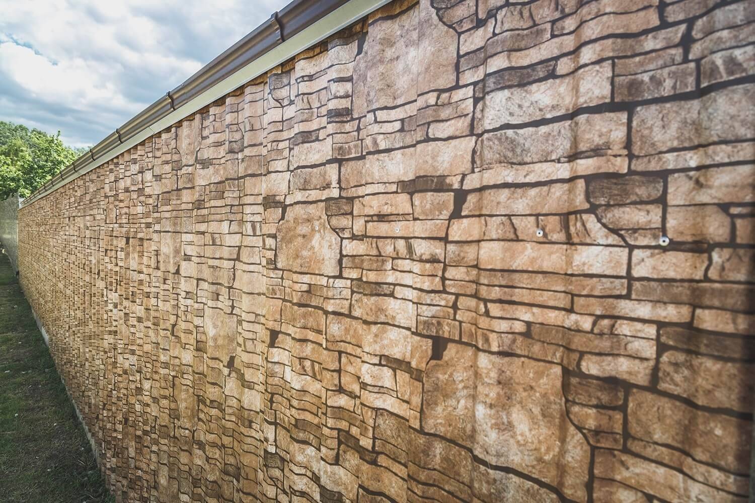 - Устойчивость к механическим повреждениям (царапинам, ударам) и погодным явлениям. Профлист с рисунком под камень покрывают специальным полимерным покрытием, благодаря этому он не выгорает даже под прямыми солнечными лучами и не гниет. Еще одним важным преимуществом является то, что материал способен выдерживать сильную ветровую нагрузку и сопротивление на излом, а это существенно, если дело касается заборов в сельской местности, для которой характерна сильная интенсивность ветра