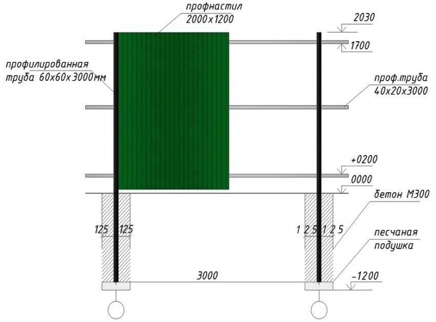 Профнастил крепят к столбам, материал которых должен сочетаться с поверхностью окрашенного металлопрофиля. Чаще используют металлические опоры, которые тонируют в спокойные или контрастные цвета. Заполнением служит профлист с имитацией камня или однотонной поверхностью.