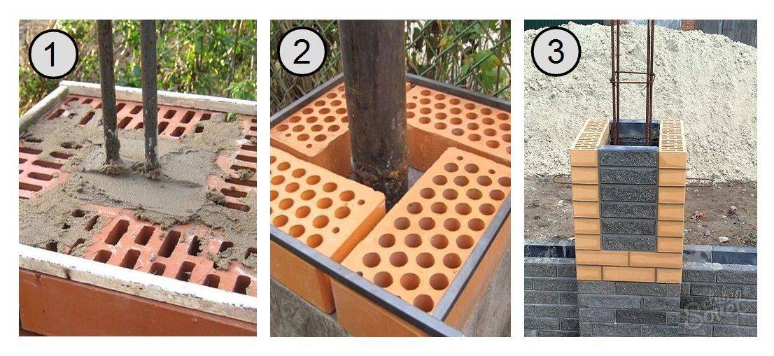 Второй метод имеет специальное назначение. В основном это кирпичные столбики для различных секций в комбинированном типе забора, а также опора для ворот и калитки.