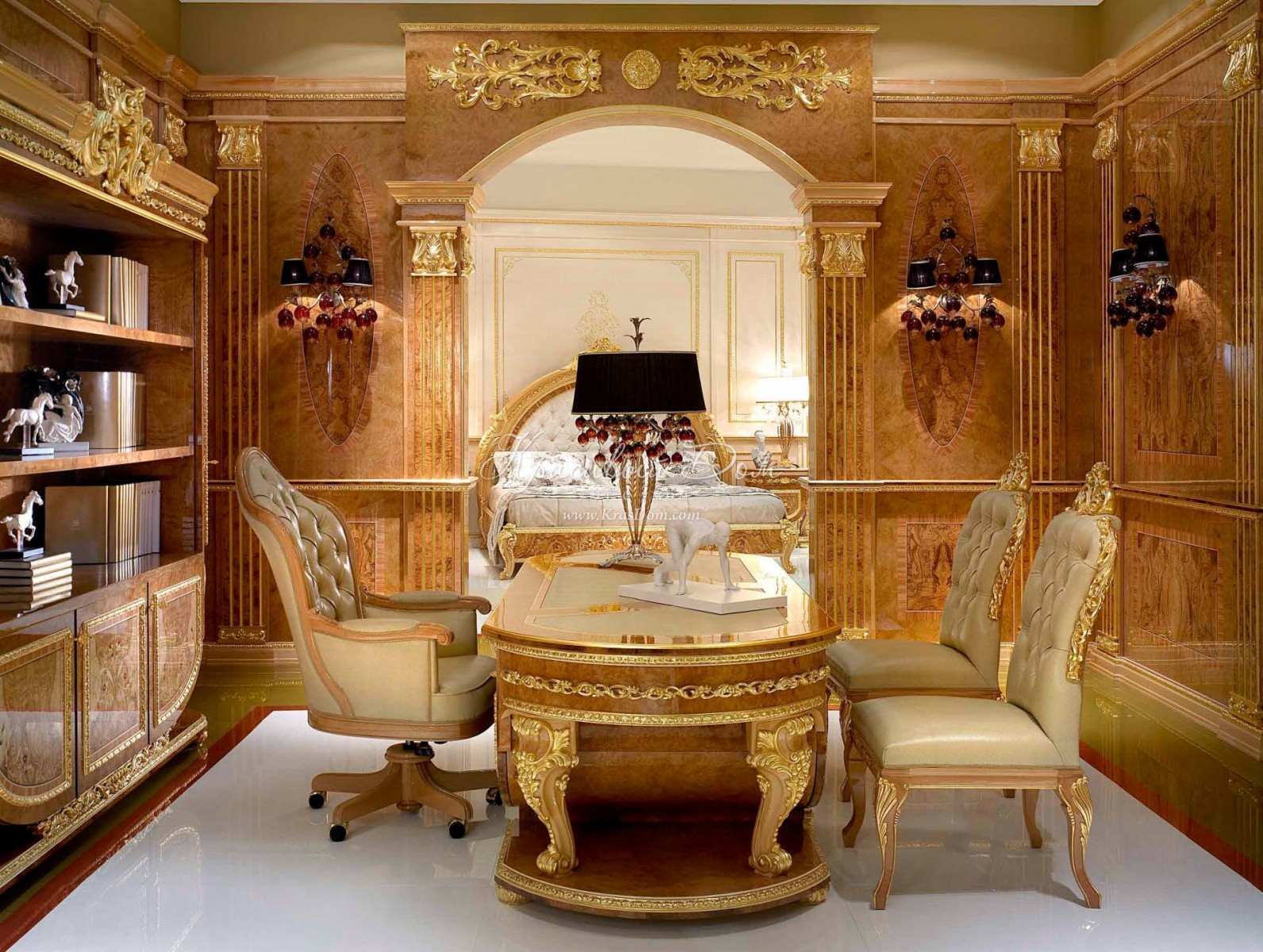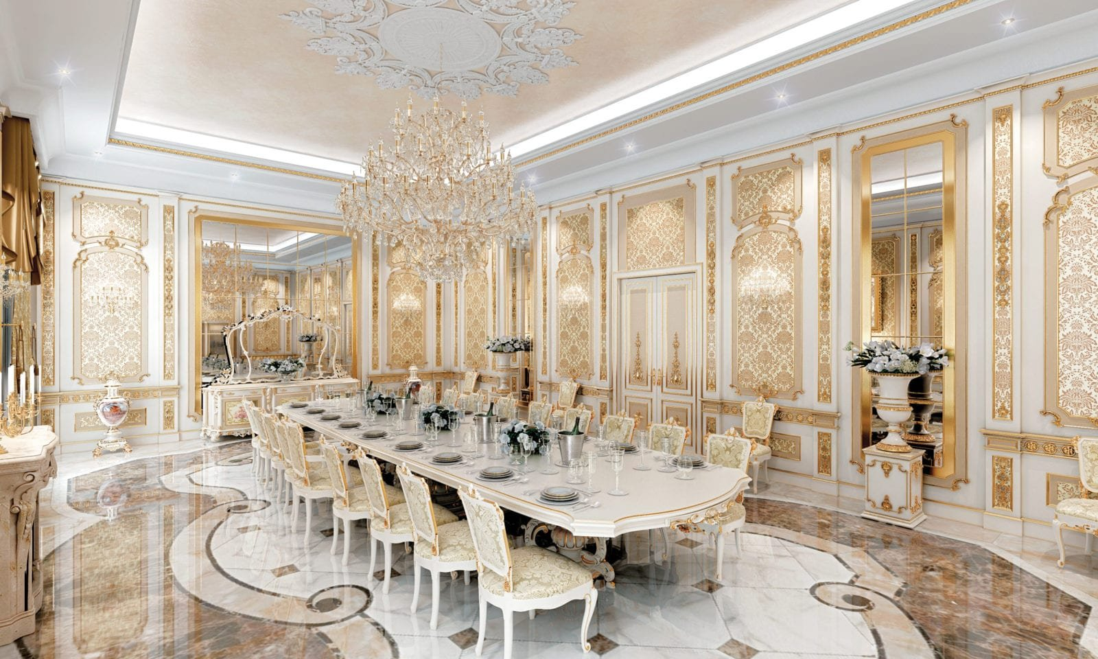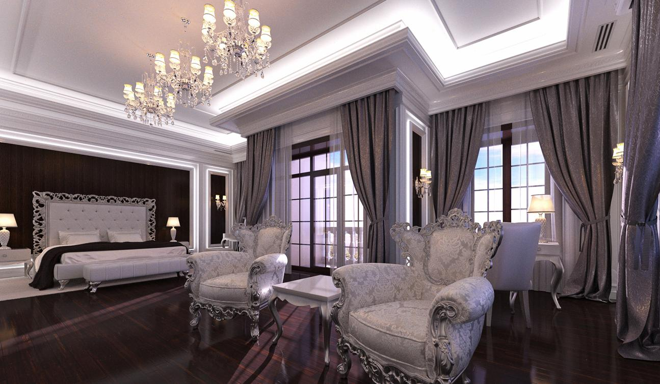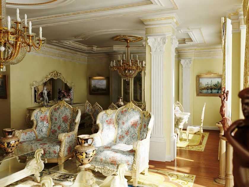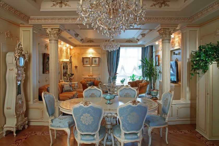 - большая люстра в центре потолка, подсвечники с канделябрами, колонны и фарфоровые скульптуры дополнят обстановку.