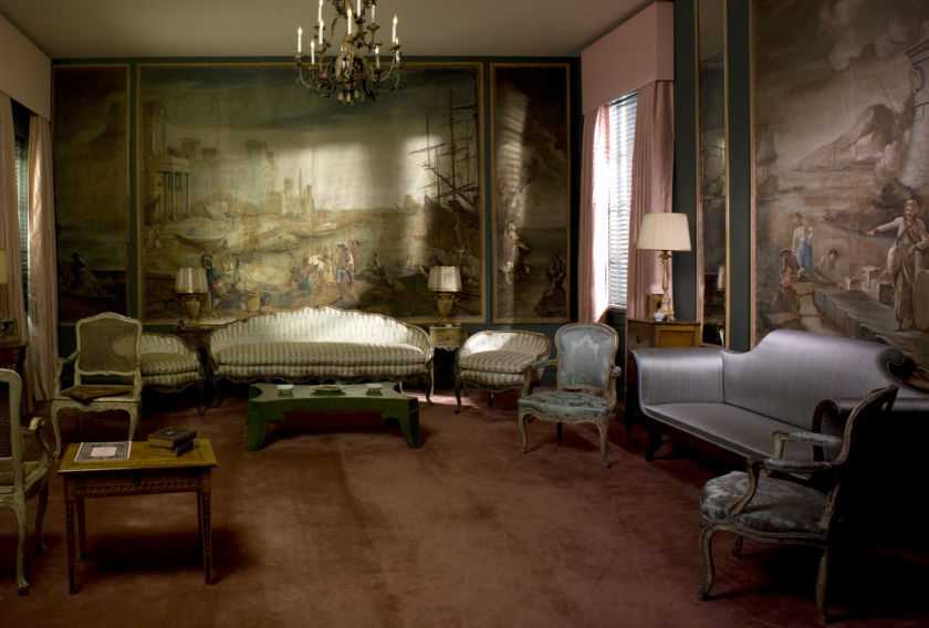Можно встретить стены из гобелена, парчи или нанесенными художником рисунками. В качестве дополнительных элементов декорации вешают картины, обязательно с позолоченными рамками, ведь все предметы декора должны подчеркивать богатство хозяев и изысканный вкус.
