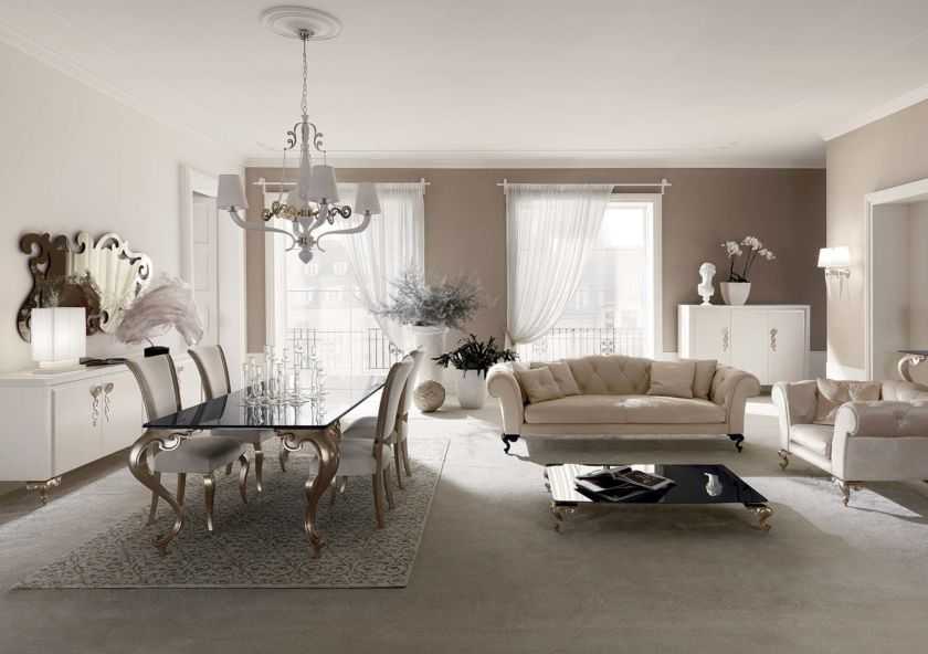 Для классического интерьера характерны спокойные тона, отсутствие резких сочетаний. Предпочтительны персиковый, беж, песочный, оливковый, медовый, кремовый, небесно-голубой. Они подходят к натуральному камню и дереву. В гостиной мебель белого и бежевого цвета смотрится наиболее выигрышно. Неуместны яркие кислотные оттенки и резкие сочетания, хотя комбинация светлого и черного используется.