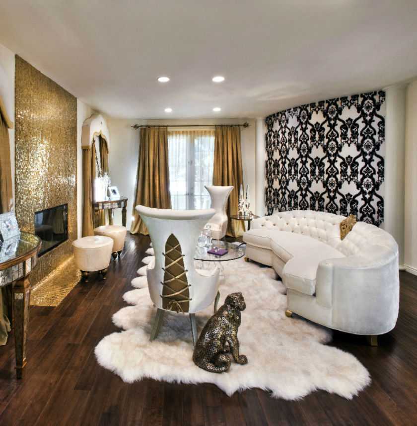 - в равных пропорциях включите в оформление комнаты белый и золотой цвет.