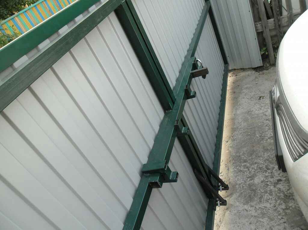 В накладных вариантах запора может быть защелка и ручка, установленная с двух сторон. Способ открывания зависит от устройства запорного механизма. Под профнастил следует подложить планку для прочности.