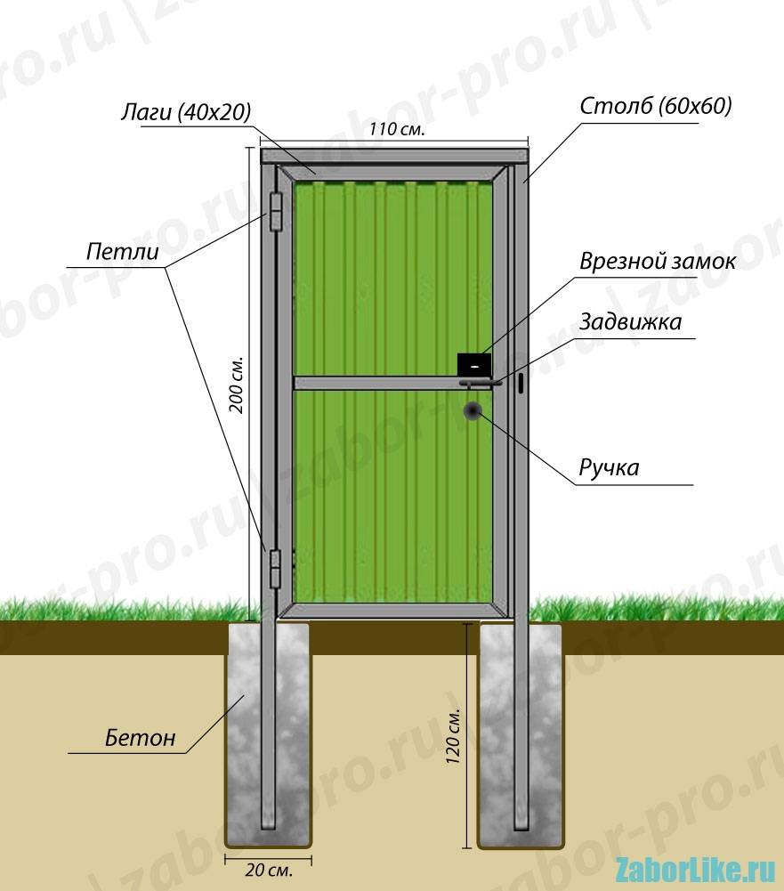 Схема калитки из профнастила с основными размерами (расположение замка).