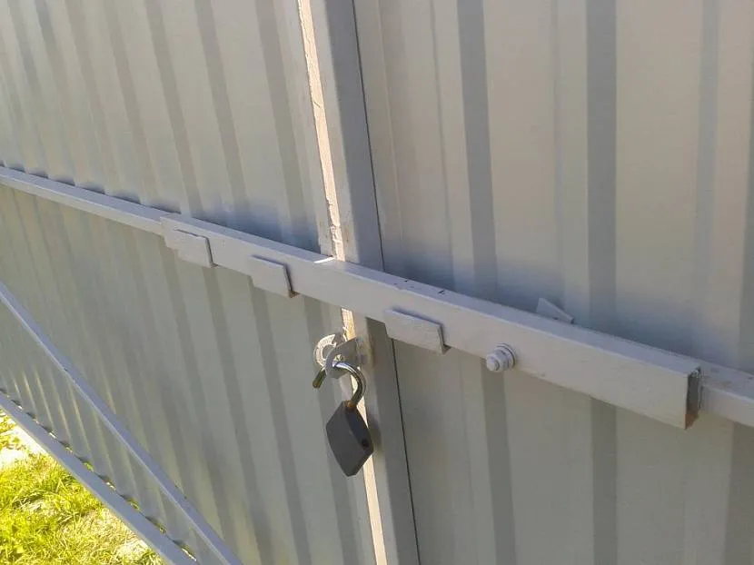Третья подгруппа – дополнительные запоры, которые располагают не на внутренней стороне ворот, а снаружи. Этот засов не может быть единственным на воротах с точки зрения безопасности. Поэтому на тыльной стороне ворот обязательно устанавливается либо вертикальный, либо горизонтальный запор.