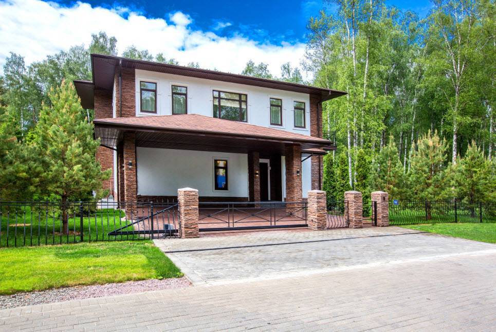 Кирпичные колонны, украшенные декоративными элементами, в сочетании с профнастилом имеют привлекательный вид. Такое дизайнерское решение подходит для частных домов.