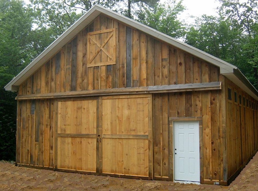 Достаточно массивный вариант с двумя воротами. Присутствуют окна на стенах, также, как и на чердаке, установлены две двери.