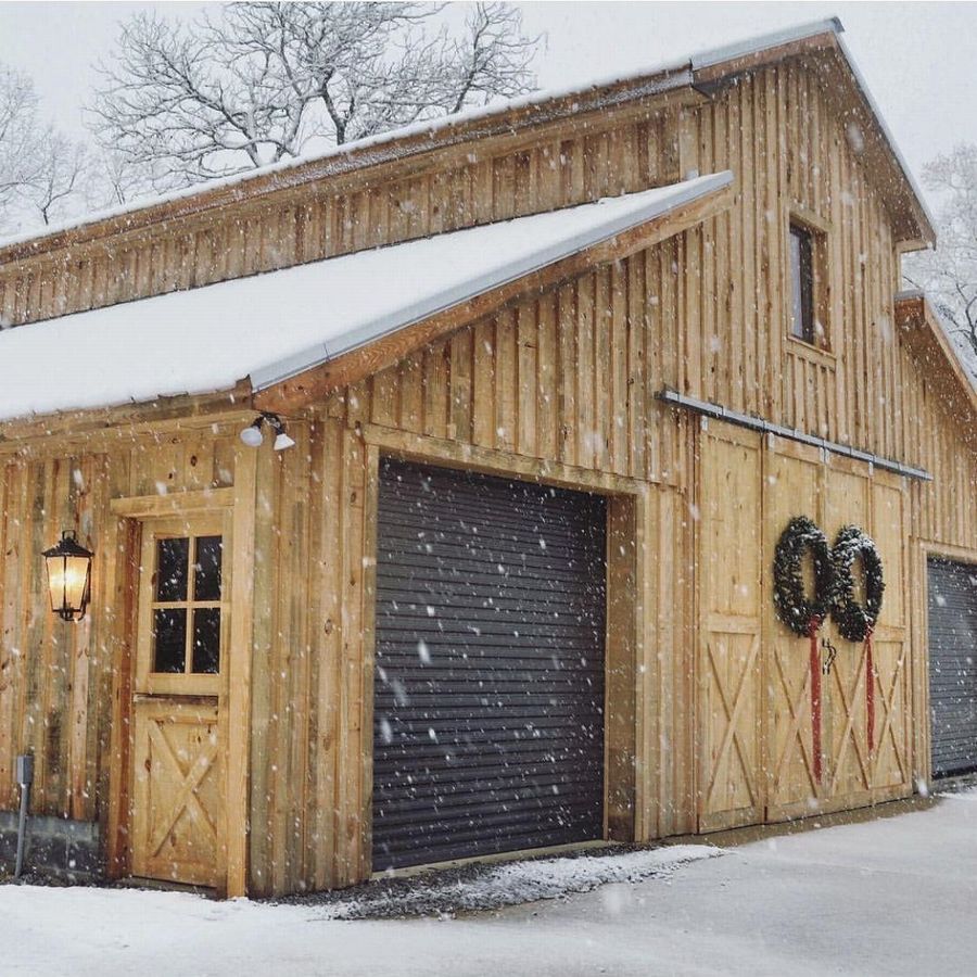 Большой двухэтажный гараж с деревянными затворками на окне. Для освещения прямо у ворот установлены небольшие фонари.