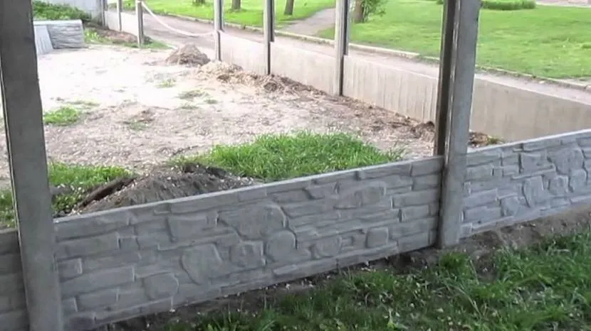 Этот забор состоит из бетонных плит, как правило, с широким основанием, которые устанавливаются без использования фундамента.