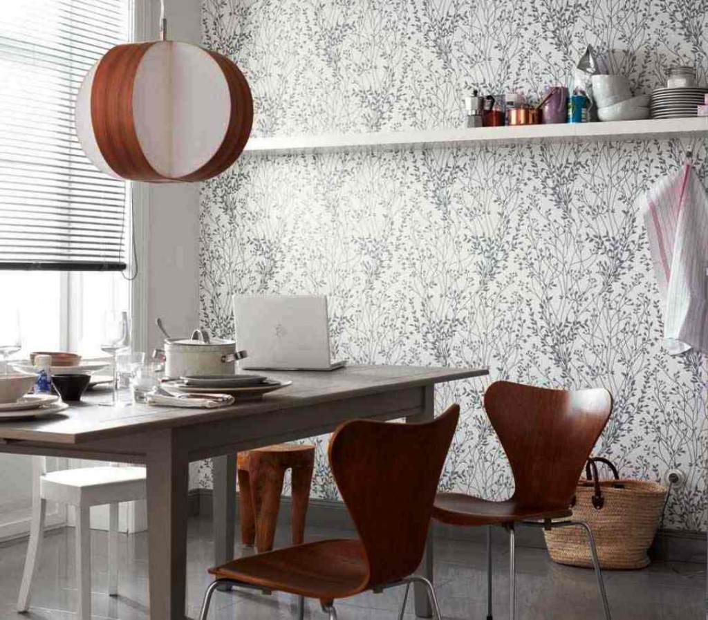 Мягкая фактура шелковых обоев подходит небольшим кухням.