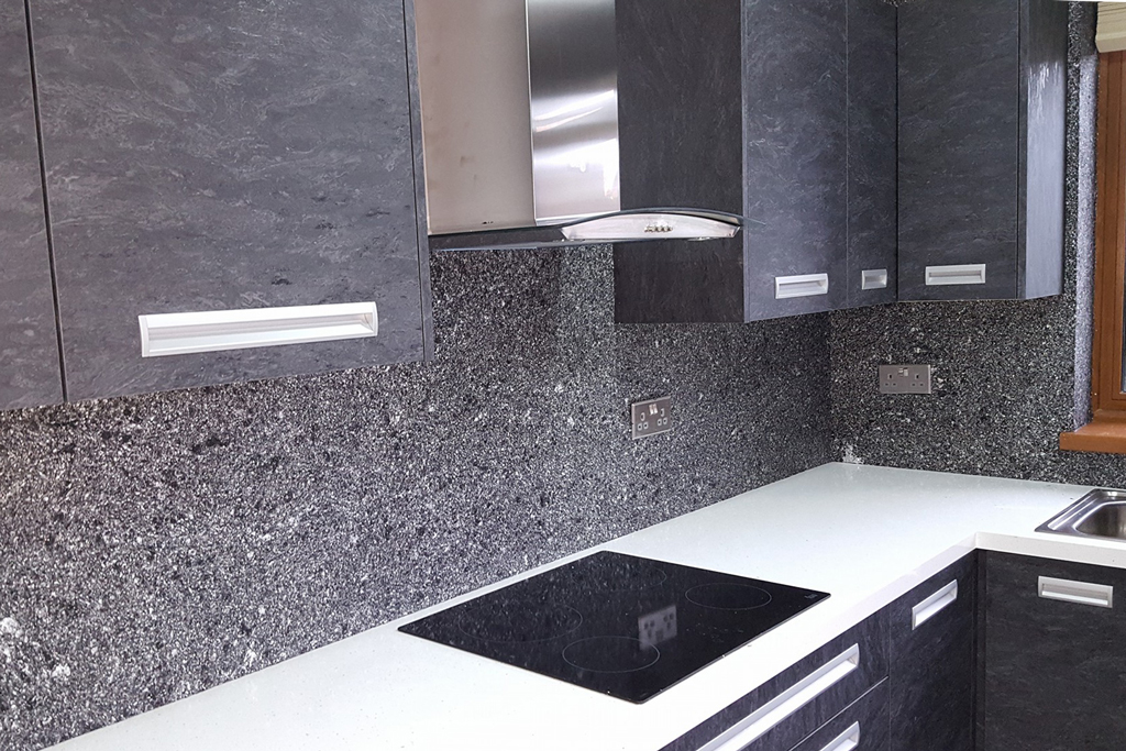 Если планируется использовать жидкие обои в области кухонного фартука, необходимо защитить этот участок от возможных загрязнений и воды. Самое простое и доступное решение – установка стеклянного полотна в этом месте.