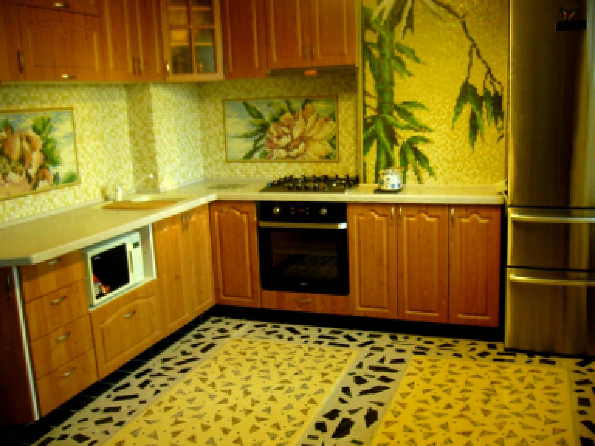 - Зоны готовки и мойки на кухне лучше всего отремонтировать кафельной плиткой или стеклом. Остальные стены, не подверженные загрязнению, можно оформить этим материалом.