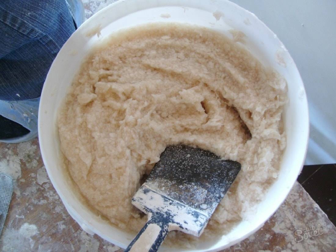 - Долго и тщательно месите «тесто». Консистенция должна стать однородной, мягкой, податливой. Напоминать очень густую сметану, которая держится на перевернутой ложке