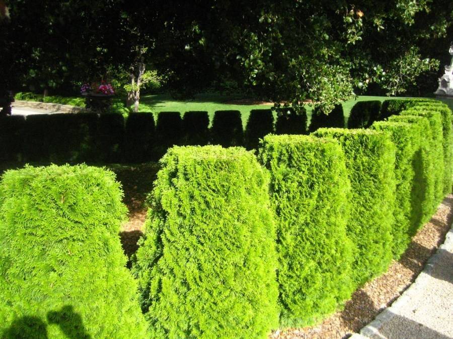 - оформление. Низкая изгородь (60–100 см) красиво обрамляет клумбы, ее высаживают вдоль тротуаров и садовых тропинок. В идеале это медленнорастущие культуры с мелкими листьями;