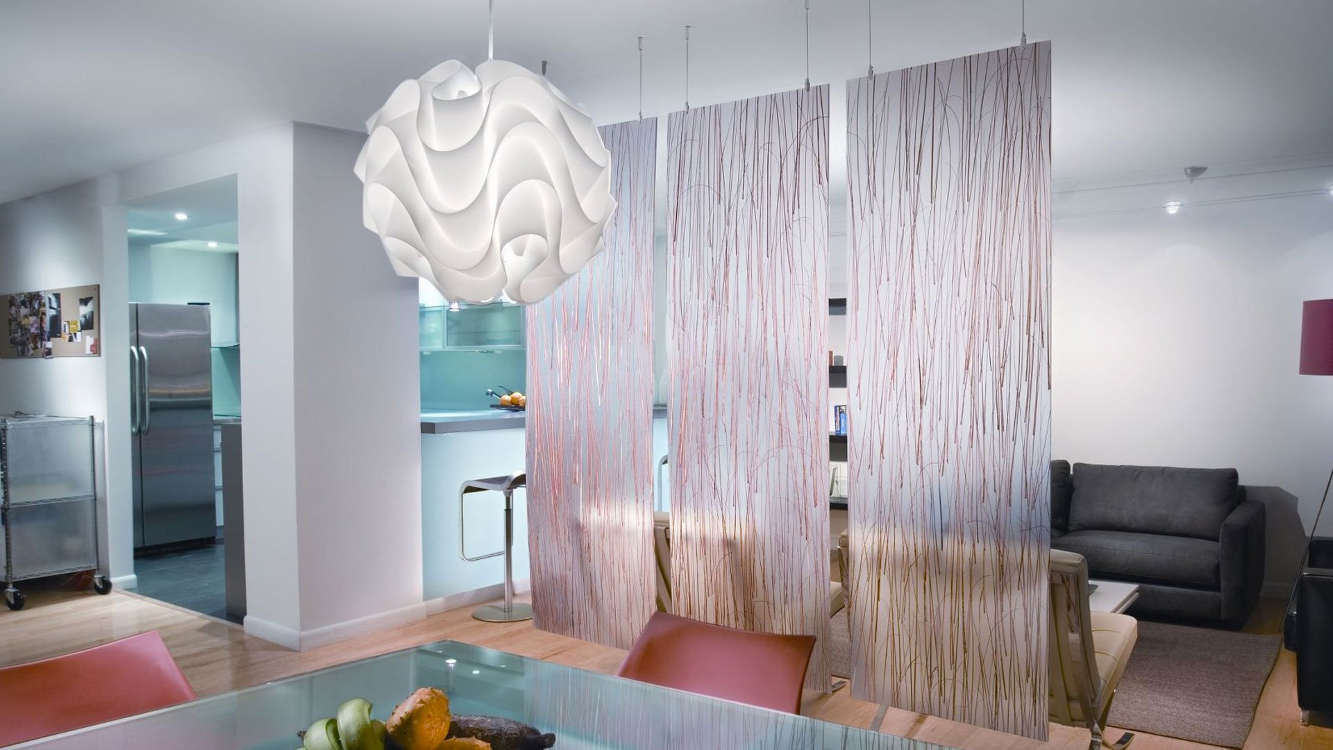 Нитяным моделям можно отдать предпочтение, если необходимо оградить часть помещения, но при этом оставалась возможность просматривания пространства. Чаще всего используются для прорисовки функциональных зон в спальнях, гостиных, столовых и кухнях.