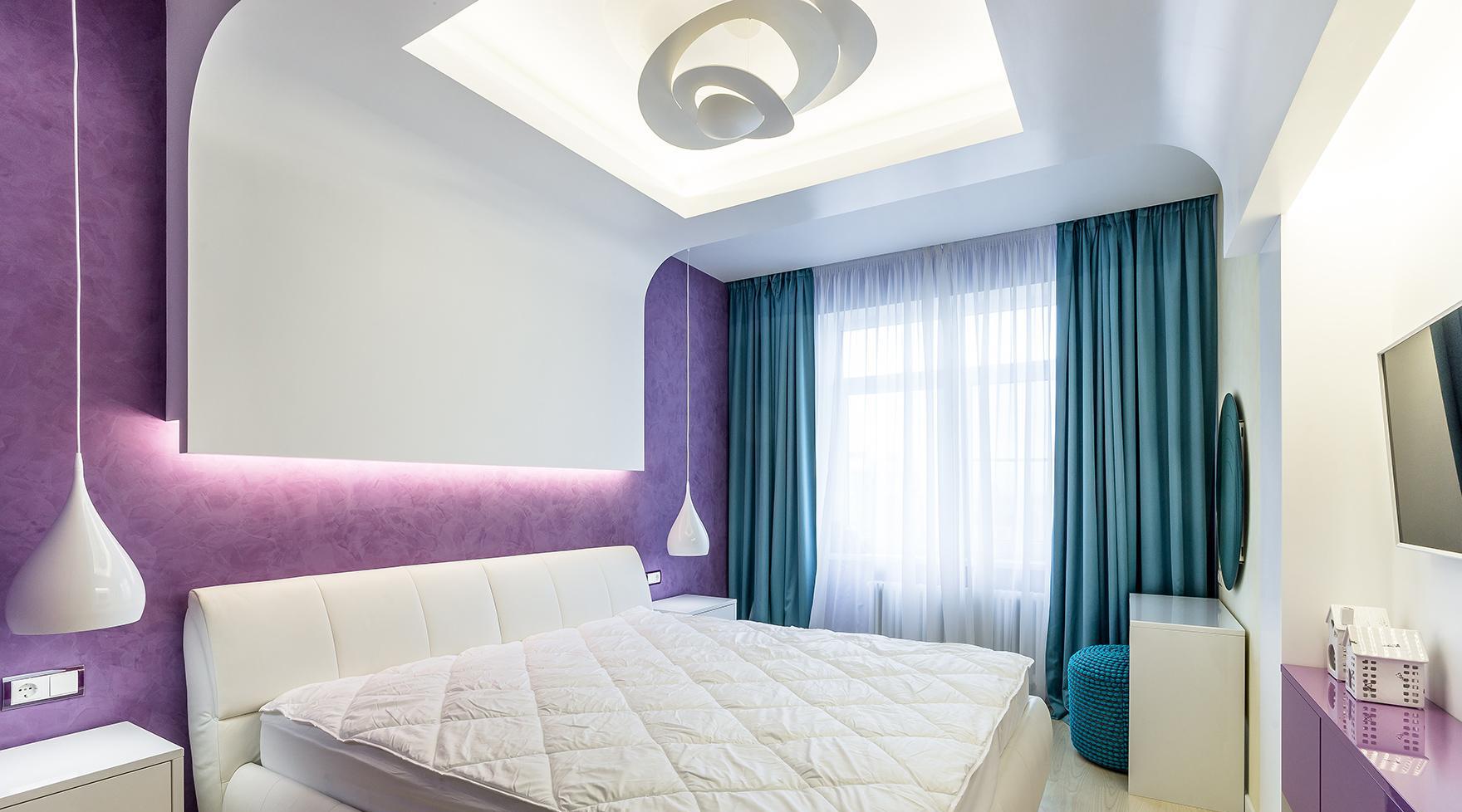 Цвет может стать не только фоном, но и средством разделения комнаты. Удачный вариант – разноуровневый или криволинейный натяжной потолок. Граница между полотнами визуально отделит спальное место от рабочего.