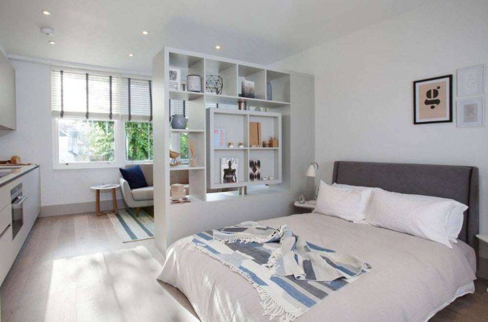 Применение перегородки стеллажа для зонирования спальни и гостиной в 16 квадратахИсточник kakpostroit.su