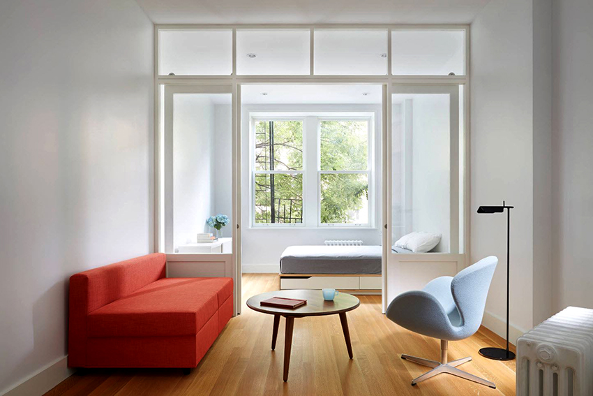 Зонирование на спальню и гостиную с помощью матовых стеклянных створок-купеИсточник distver.ru