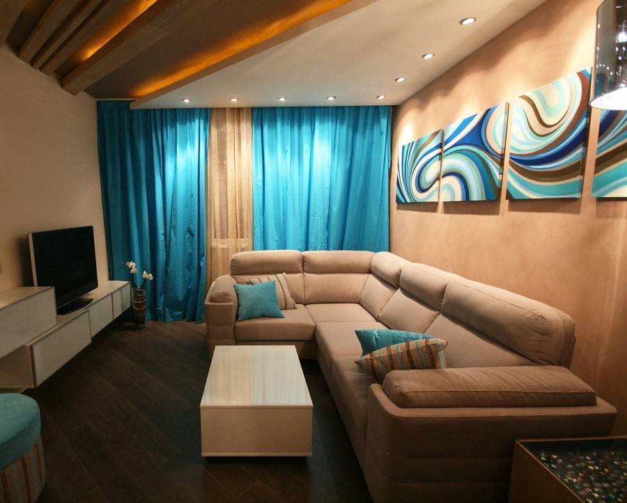 Особого внимания в гостиной заслуживает диван. Предмет интерьера подбирается в тон к ремонту. Кроме дивана размещается небольшой столик и комод. Для правильного планирования расстановки мебели, сначала нужно замерить все предметы и нарисовать на бумаге согласно масштабу.