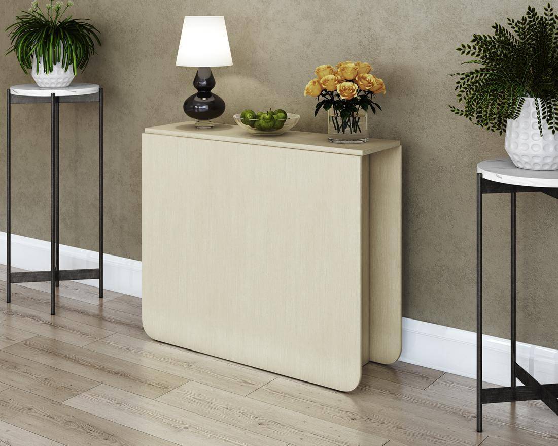 Этот необычный журнальный столик относится к категории трансформеров. Характеризуется наличием не только оригинального дизайна, но и простотой в последующем пользовании. За повышенное удобство в эксплуатации отвечают стальные петли и механизмы, которые скрыты от посторонних глаз. При необходимости изделие превращается в конструкцию, рассчитанную на 6 персон. Отличное решение для малогабаритных гостиных и кухонь, в которых отсутствует свободное пространство. Заявленные размеры: 200х800х200 мм. Для изготовления применяется ЛДСП.