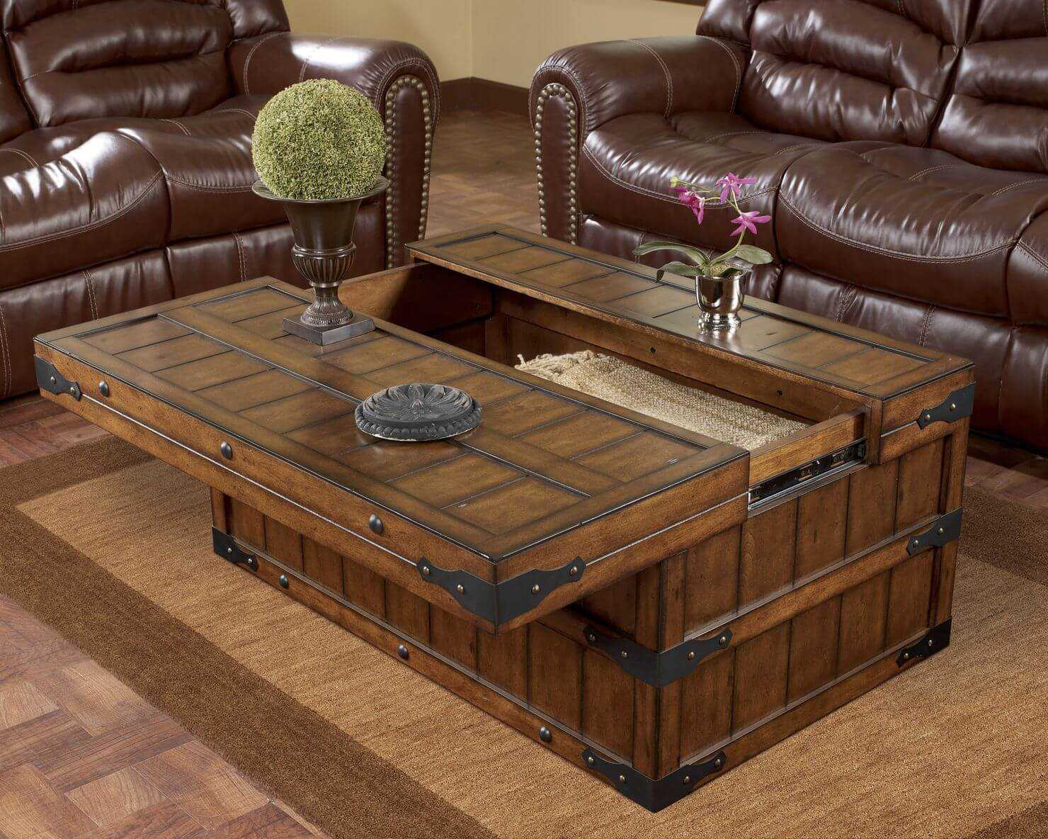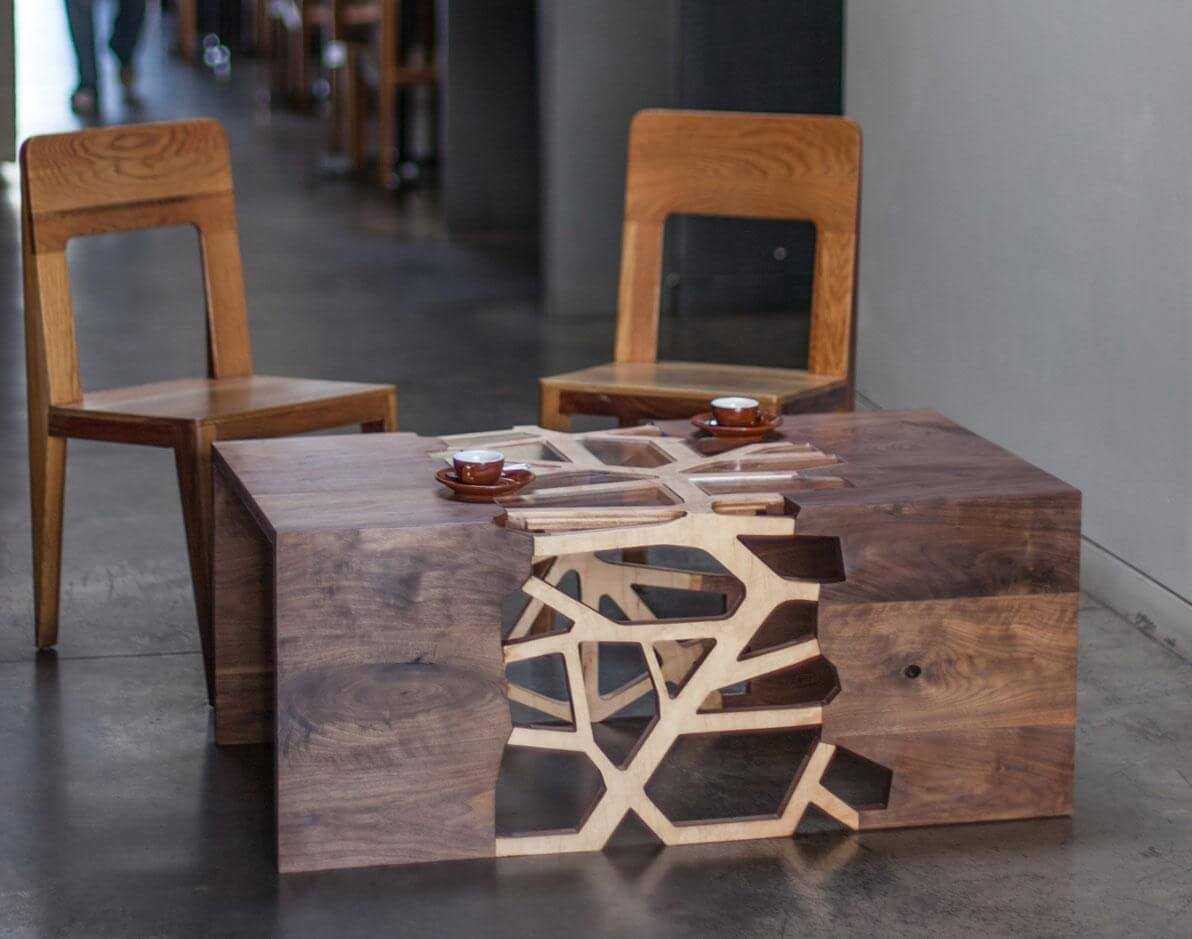 Деревянные журнальные столики могут поражать не только своей формой. Некоторые модели вызывают немалое удивление благодаря своей нестандартной отделке.